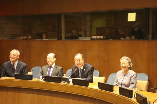 图为联合国秘书长潘基文夫妇与参会者合影 邓敏摄