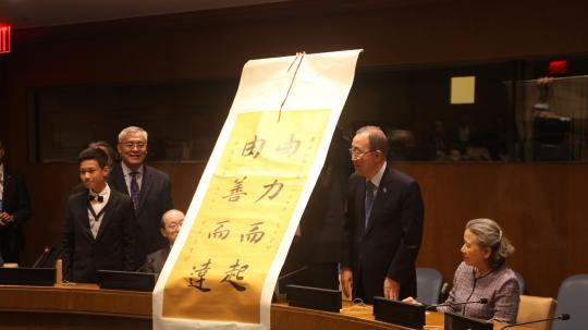 当天,来自中国的书法爱好者代表叶军堃还向潘基文赠送了书法作品“由力而起 由善而达”,表达了青少年对联合国和平事业以及人类和谐发展的展望。接下来,“周斌教授书法艺术国际巡展联合国特展”、“大字书法国际交流联合国总部特别展”等一系列中国书法文化活动也将陆续展开。