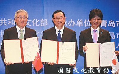 中国文化部部长雒树刚(中)、韩国文化体育观光部长官金钟德(左)、日本文部科学省副大臣义家弘介(右)共同签署《青岛行动计划》