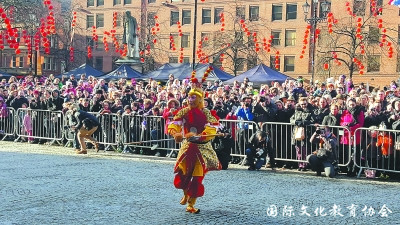 最热闹的是市政广场前的大舞台。挂满树梢的红灯笼将现场装点得无比喜庆,广场舞台前人山人海。《小苹果》、《鸿雁》等熟悉的旋律触动了华人华侨思乡的心。随后,激昂的旋律响起,盛装的美猴王腾空而出,金箍棒舞得虎虎生风,机灵样逗得人忍俊不禁。随着舞狮队的加入,浓郁的中国风把现场的热情彻底调动起来,一向矜持保守的英国人也忍不住上前互动、拍照,扮演孙悟空的演员蒋进因为太受欢迎而频频被拉住拍照,在人群中根本走不动。