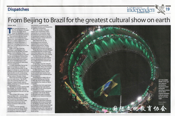 8月7日,值里约奥运会开幕及北京奥运会开幕8周年纪念之际,中国驻南非大使馆文化参赞郑文在南非主流报纸《星期日独立报》发表题为《从北京到巴西,世界文化的盛会》的专题文章,以参与北京奥运会开幕式筹备过程的亲身经历,回顾北京奥运会开幕式的辉煌时刻。文章表示,从北京到里约先后举办奥运会,反映了新兴国家在全球越来越重要的地位。文章倡议中南两国以2022年的北京冬奥会和德班英联邦运动会两次重大国际赛会为契机,加强体育领域的合作。